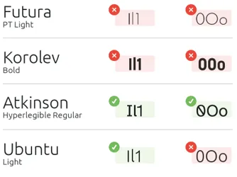 Évitez d’utiliser des typos où le design est similaire, voire identique pour des caractères différents. Comparez le groupe de caractères « L » minuscule, le « i » majuscule et le chiffre « 1 », ou encore le groupe « o » minuscule et majuscule et le chiffre « 0 ». Chaque caractère doit être différent pour faciliter sa compréhension.