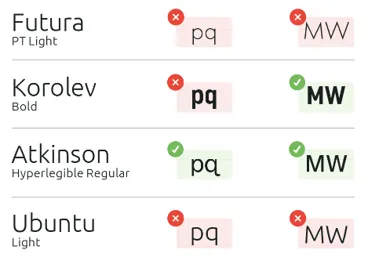 Il peut arriver de confondre les lettres b, d, p et q. Les rendre différentes permet de diminuer les risques de confusion. Tout comme les caractères similaires, les lettres miroirs doivent présenter des différences pour faciliter leur distinction.